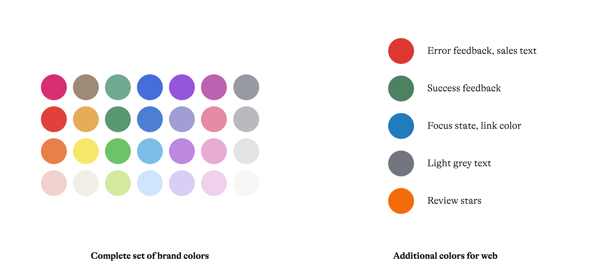 Our new brand palette had 28 colors, and we worked with Collins to make sure that every one of those colors was at least a 4.5:1 contrast ratio against black text. We also needed some colors specifically for the web, like a blue for focus states and a yellow for review stars, that also met color contrast needs for UI. I came up with a few additional, accessible colors for these specific contexts that worked with the original set.